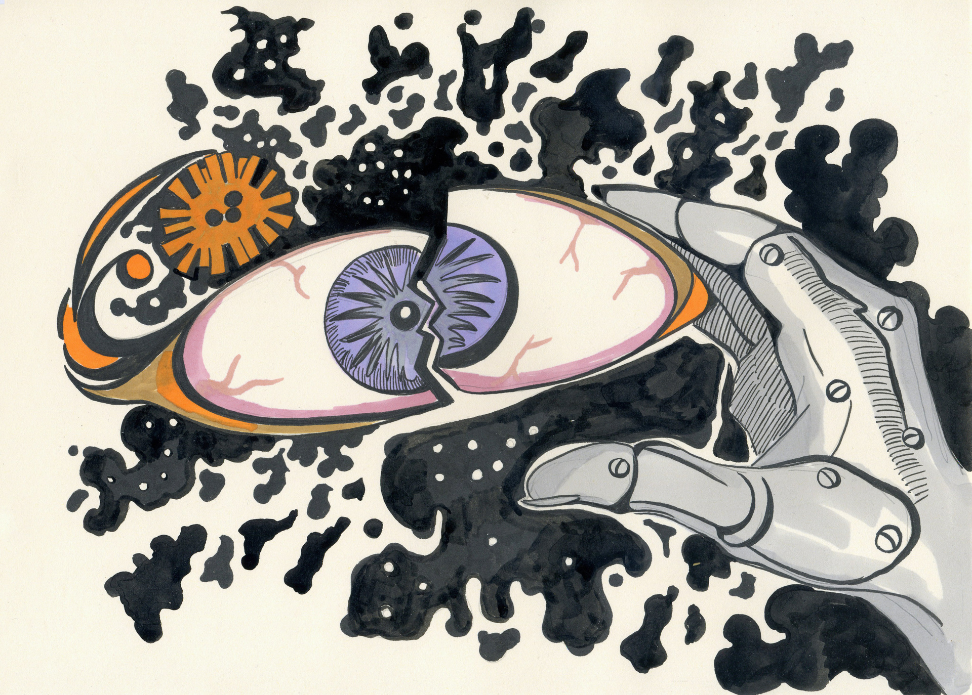Глаз, который видит слишком много. Бумага, линеры, маркеры. Формат А4.