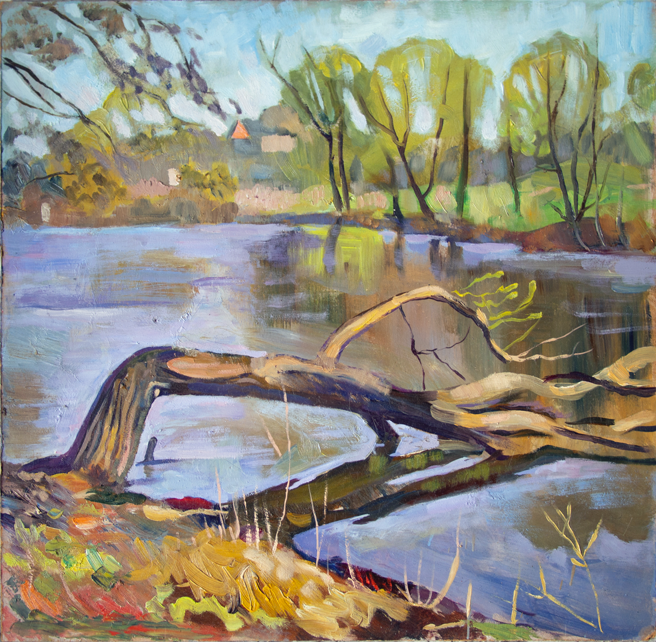 Поваленное дерево. Масло на оргалите. Размер 44 х 45 см, 2023 год.