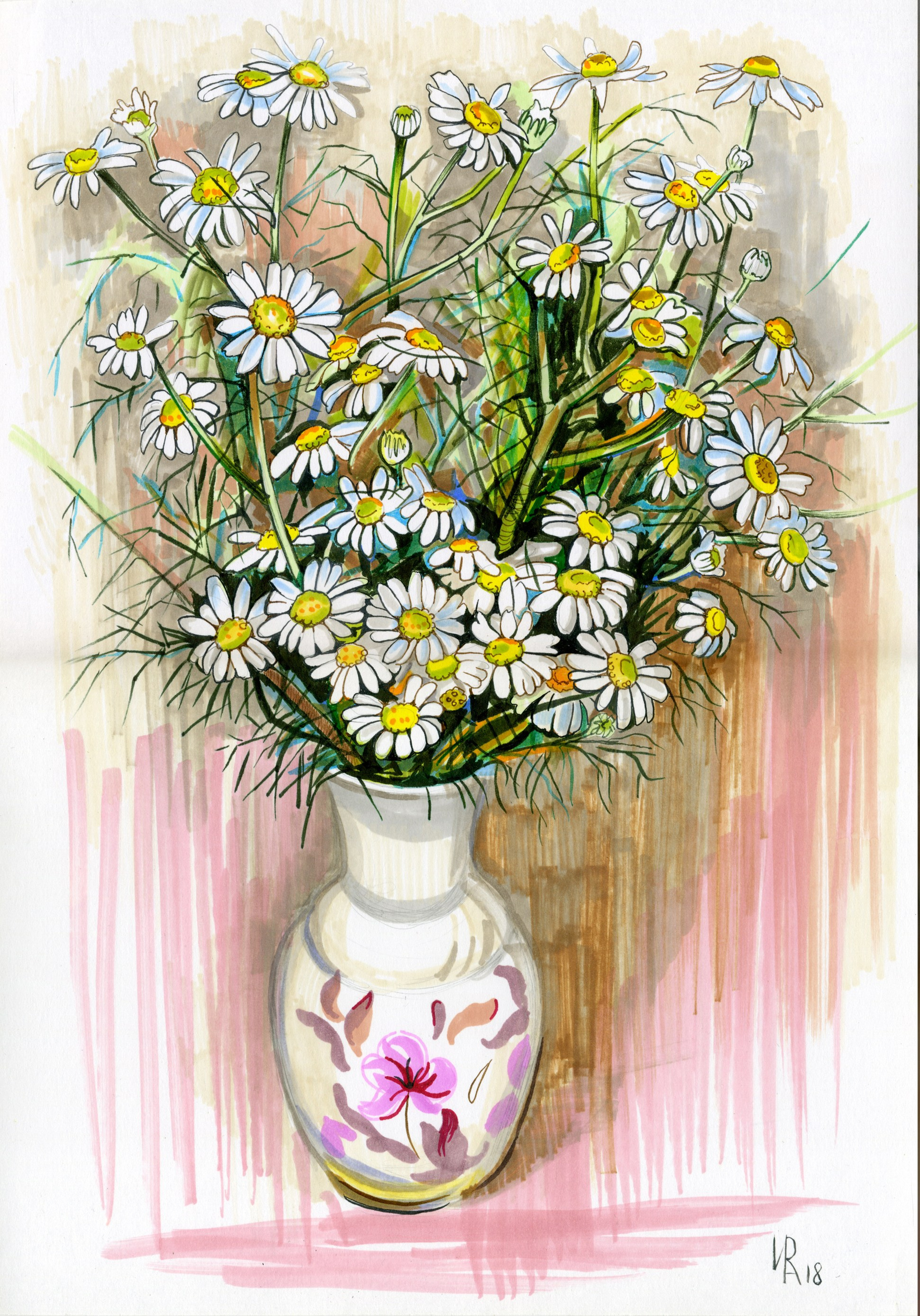 Натюрморт с ромашками. Маркеры, бумага А3. 2018 год